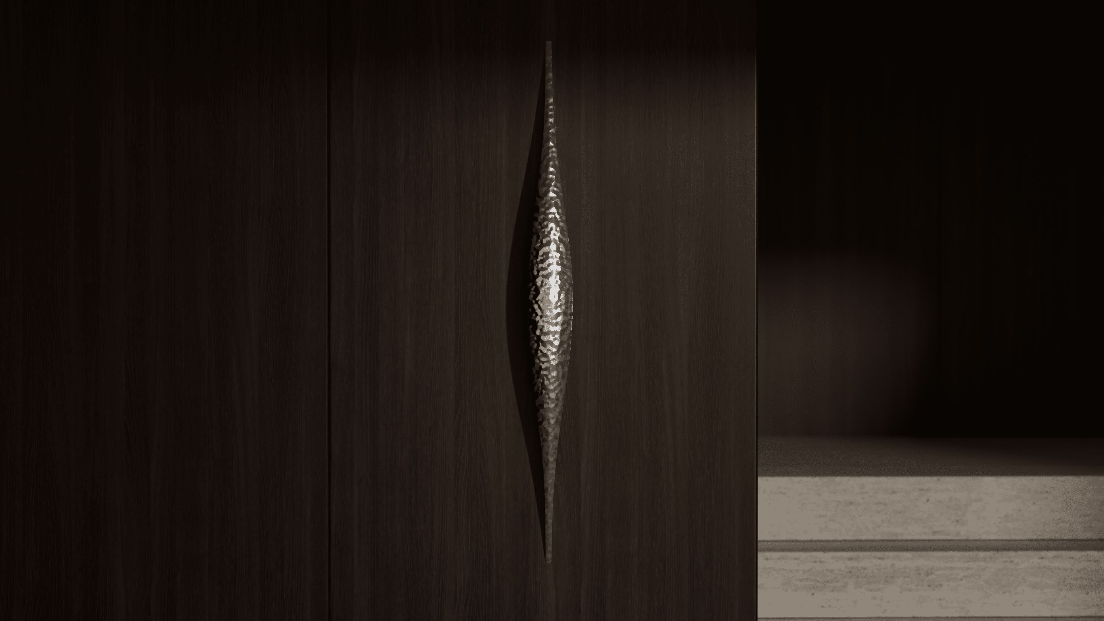 Carved with precision, the Nyxele Sconce channels light through a narrow fissure, its hammered metallic core radiating a subtle, atmospheric glow. Both elemental and refined, the design embodies a balance of shadow and illumination, offered in customizable metal finishes that adapt seamlessly to bold or understated interiors.