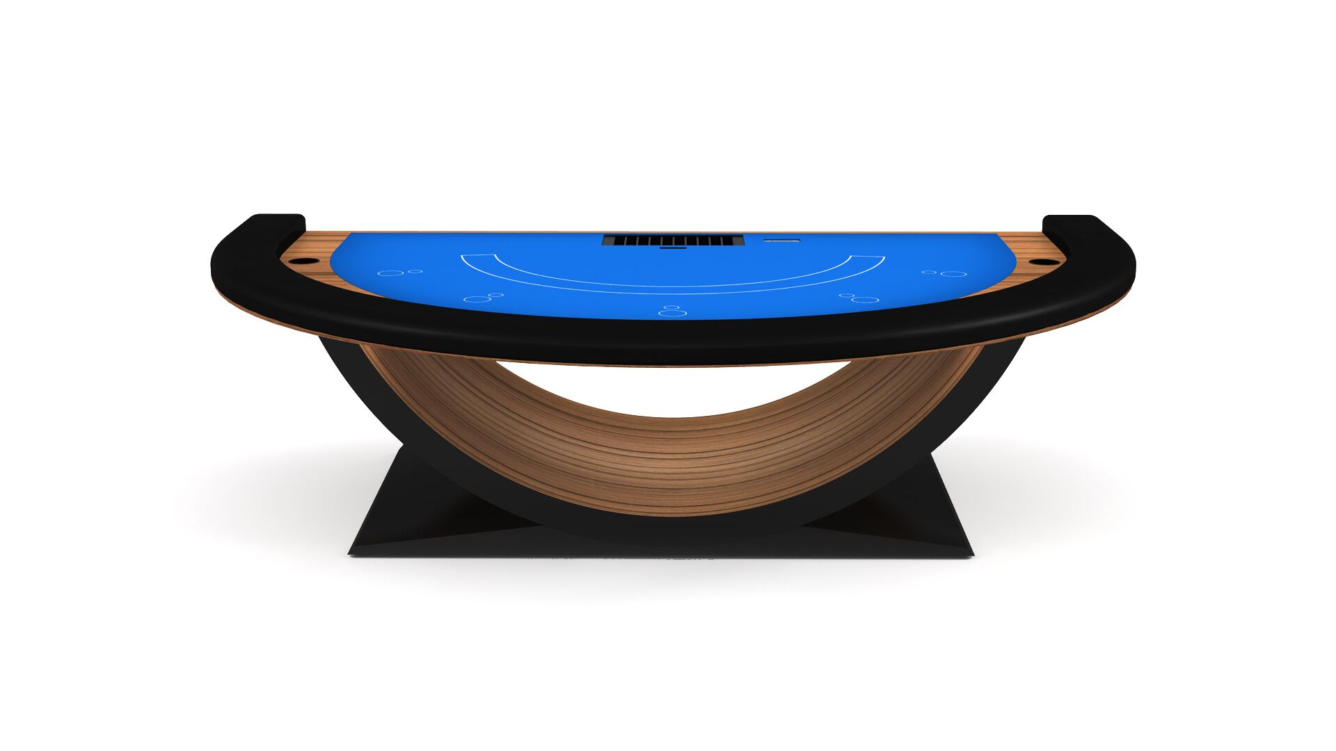 Our blackjack tables feature a customizable professional grade gaming suede playing surface, leather top for ultimate sophistication and comfort, and optional card counters/shufflers. Tables are handcrafted with the finest woods and finishes, ardently built one at a time to the specifications of their visionary.